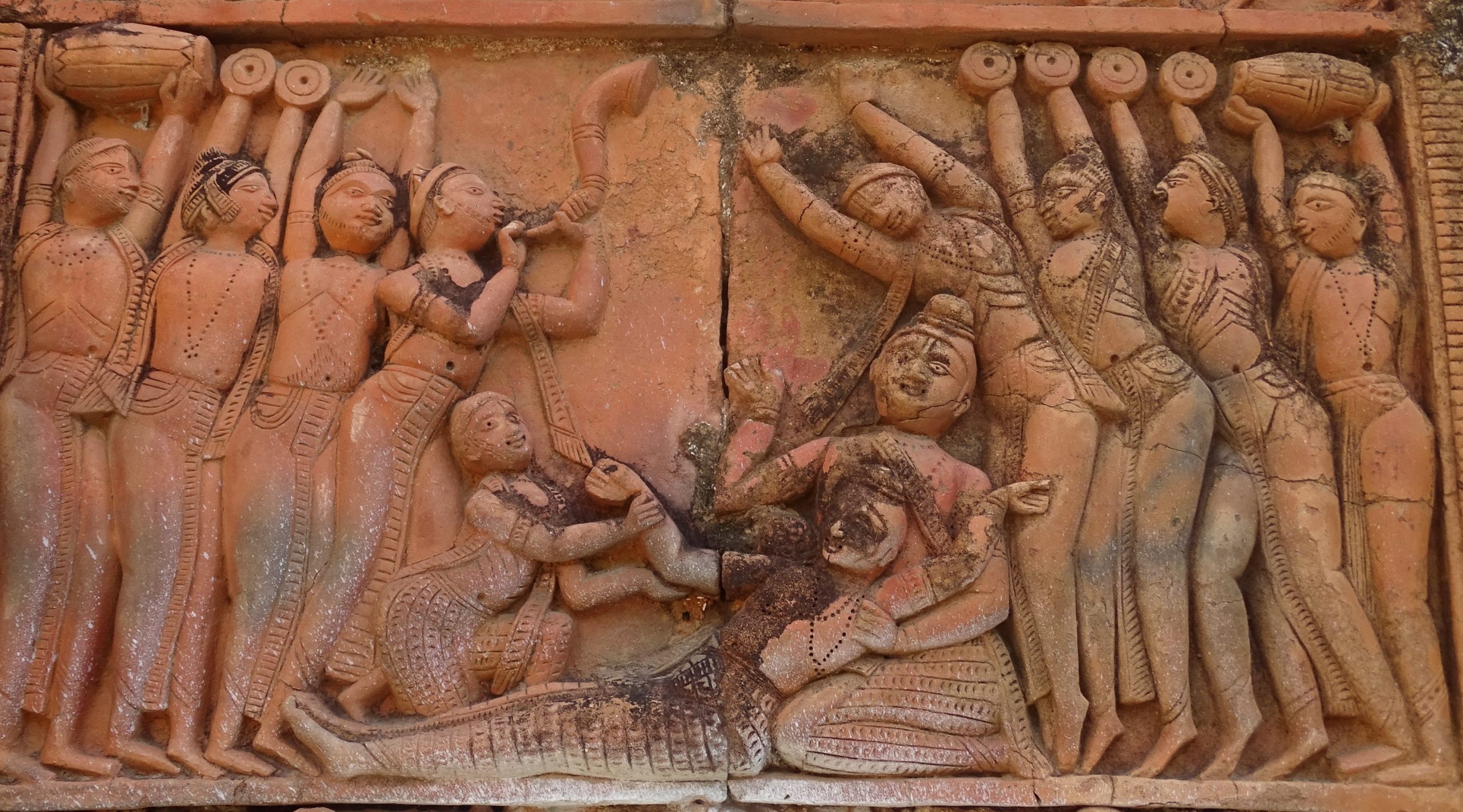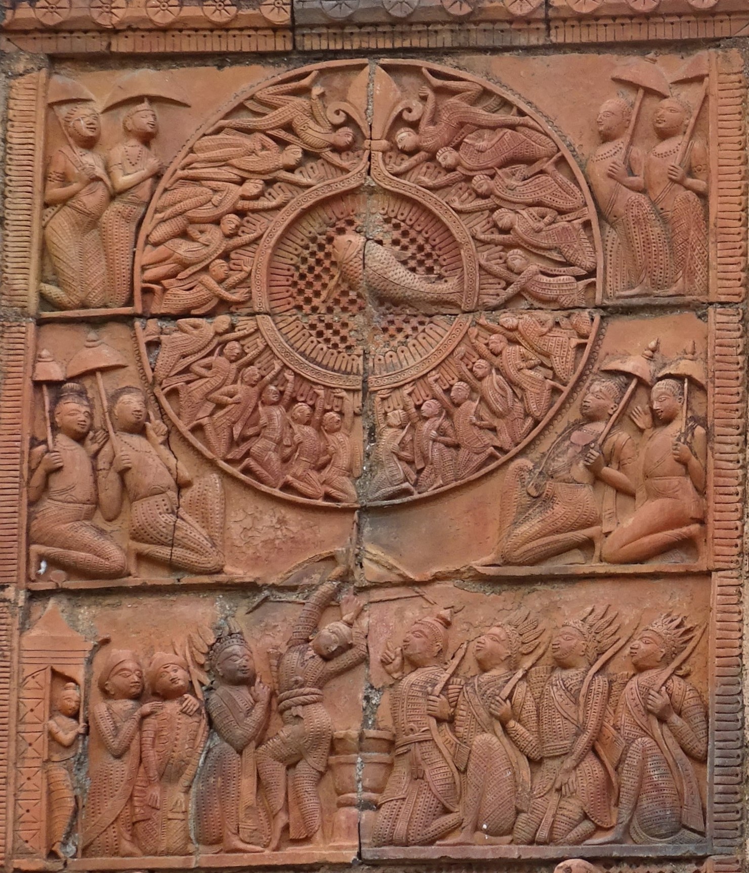 The plaque depicting Arjuna's target piercing in the swayamvar sava ( a ceremony where a bride chooses her groom) amidst the terracotta decorations in the temple is very beautiful. Such a plaque is not often seen.