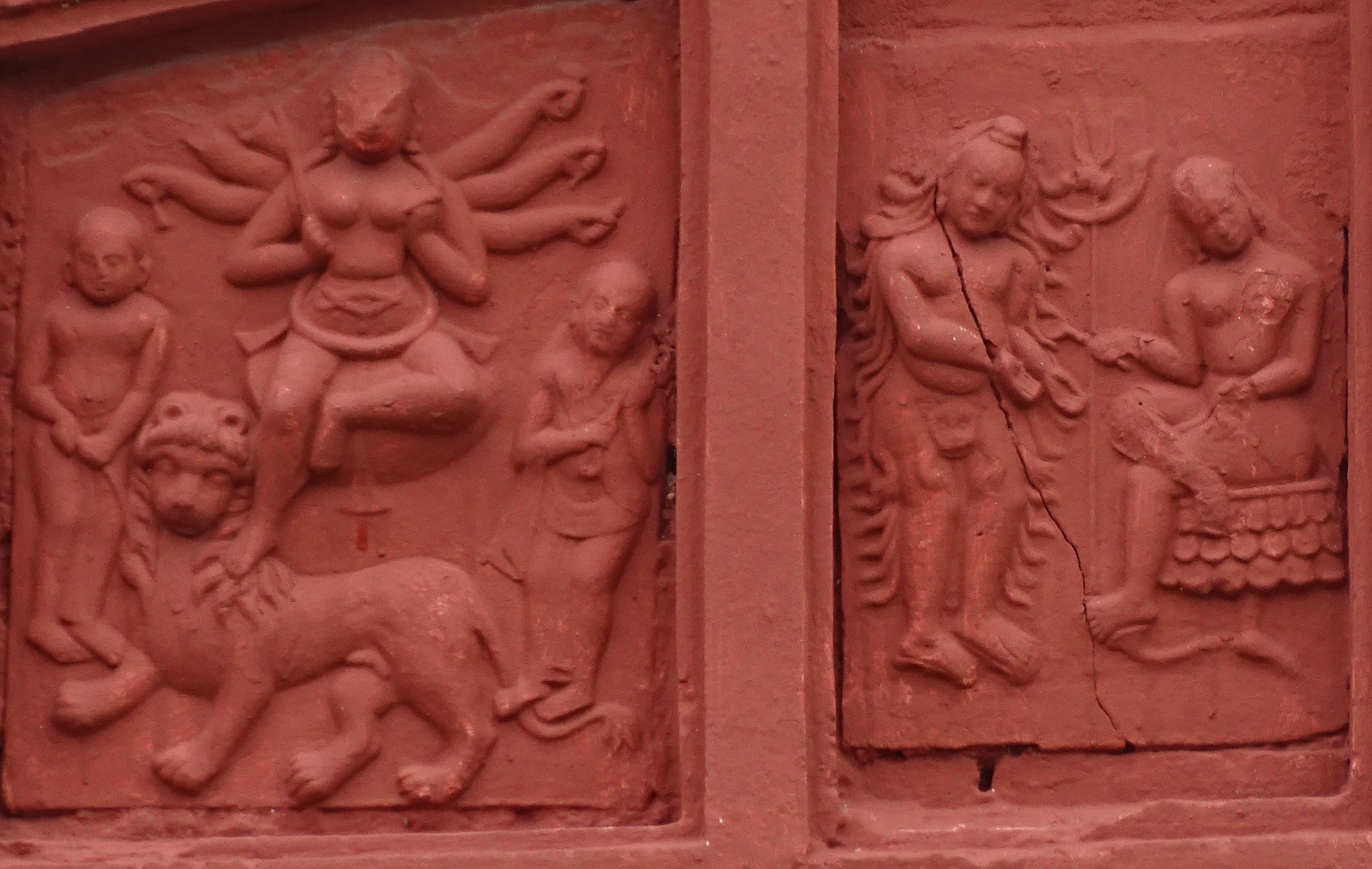মন্দিরটিতে প্রচুর টেরাকোটা অলংকৃত ফলক রয়েছে। সংস্কারের প্রাবল্যে এবং নির্দিষ্ট সময় অন্তর অন্তর পুরো মন্দিরটির রং করার ফলে টেরাকোটা কারুকার্য বিনষ্ট হয়েছে।। অনেক ক্ষেত্রে রঙের ওপর রঙ তার ওপরে রঙ চাপার ফলে পলেস্তারা শুদ্ধ খুলে বেরিয়ে আসছে।