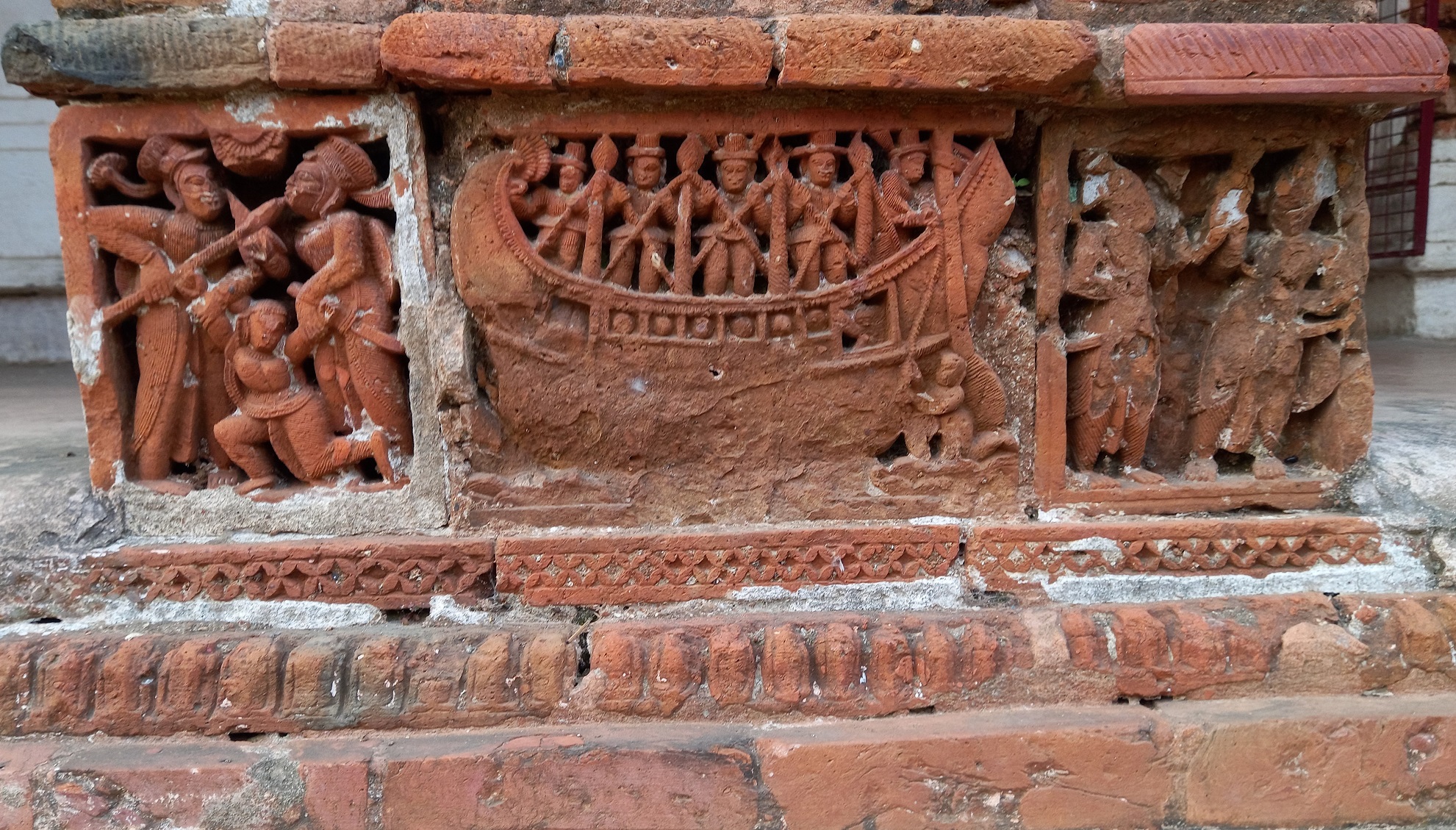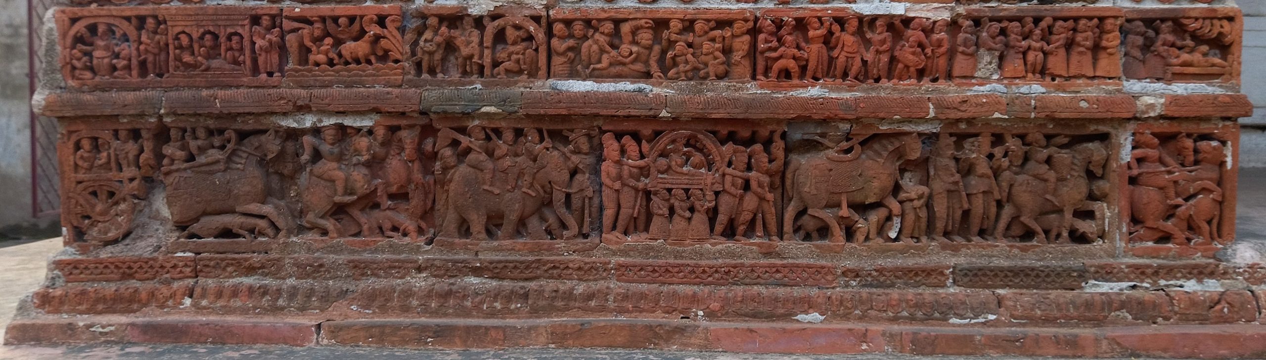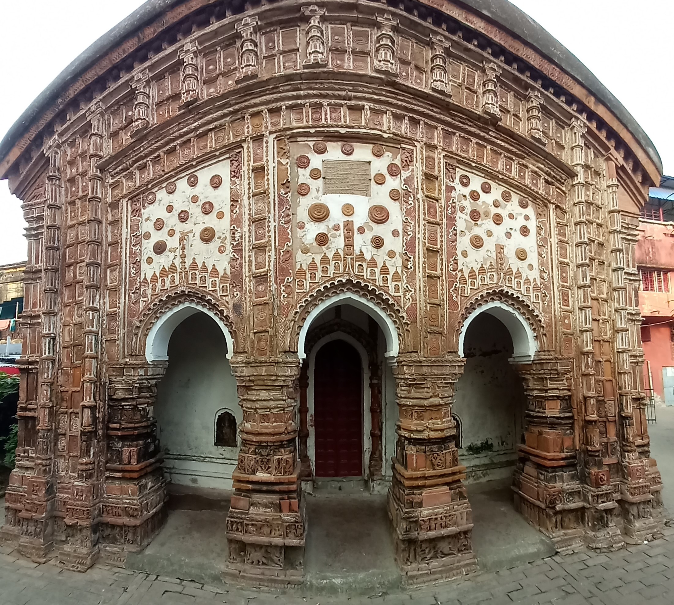 The Atchala temple with its curved cornice has a rich terracotta panel work on its facade. The temple, situated on a high altar, has terracotta panels arranged all over it from the foot to the cornice. Although the plaques are largely damaged, the plaques depicting flower carvings, dancers, war journeys, and the Ten Mahavidyas are still beautiful. The foundation inscription written on white stone in the temple is as follows -