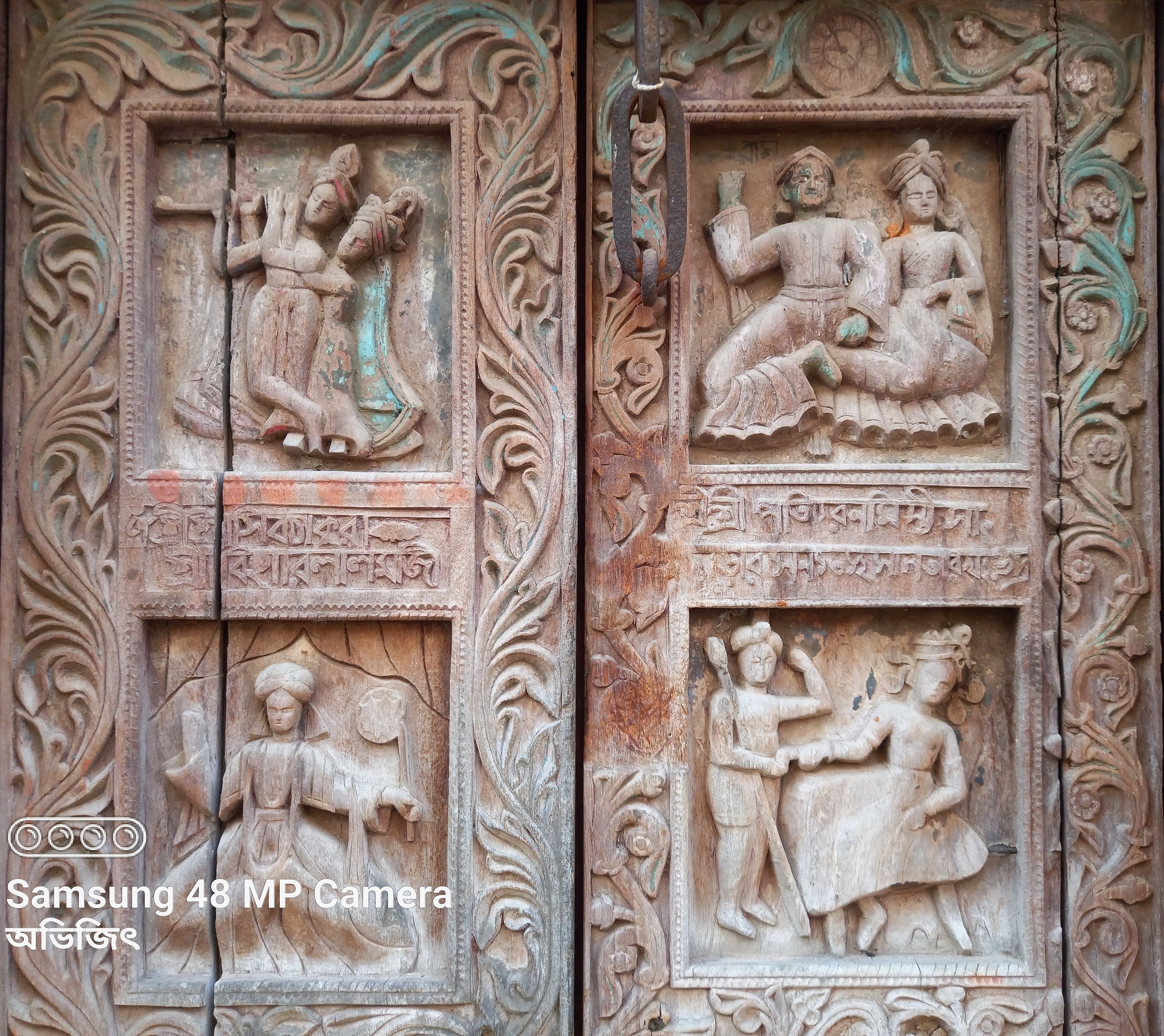 The doors leading to the sanctum sanctorum of both temples are wooden and intricately carved. On either side of the door are statues of male and female gatekeepers.