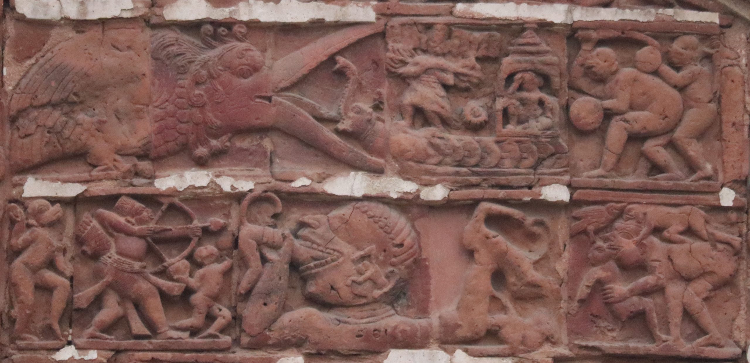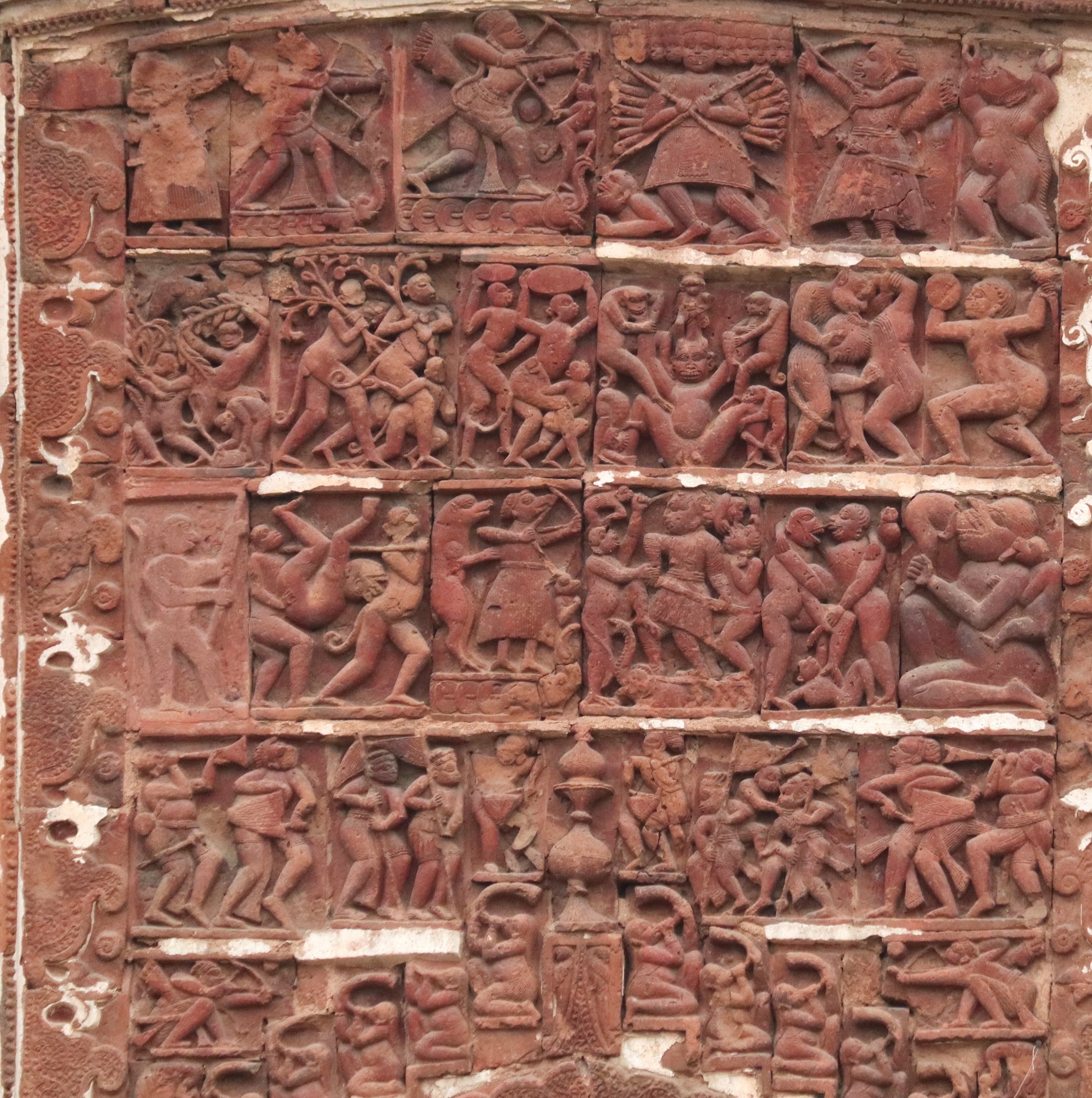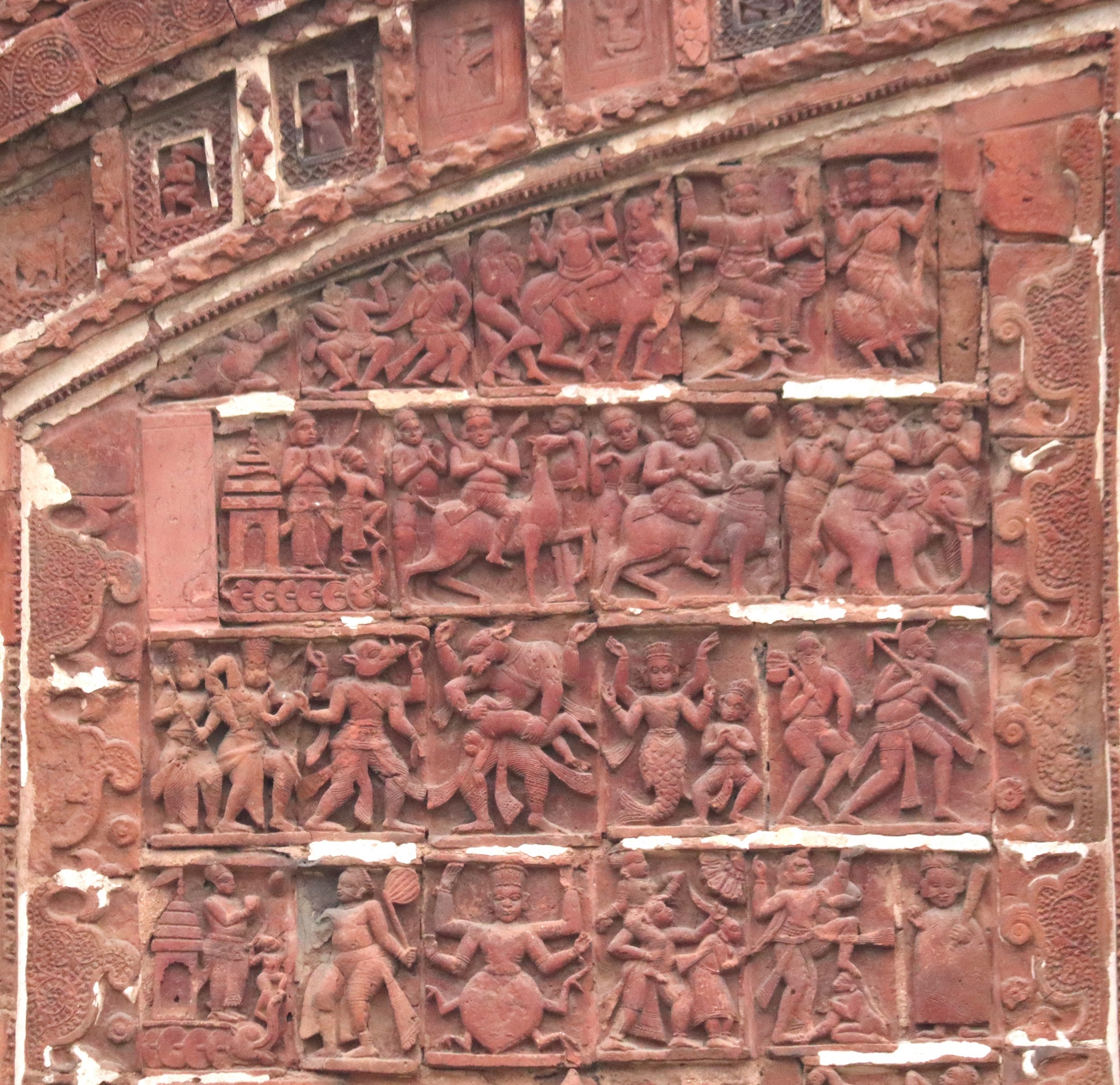 The Navaratna spires of the temple are believed to be of the Pira style. The temple facade is decorated with many terracotta panels