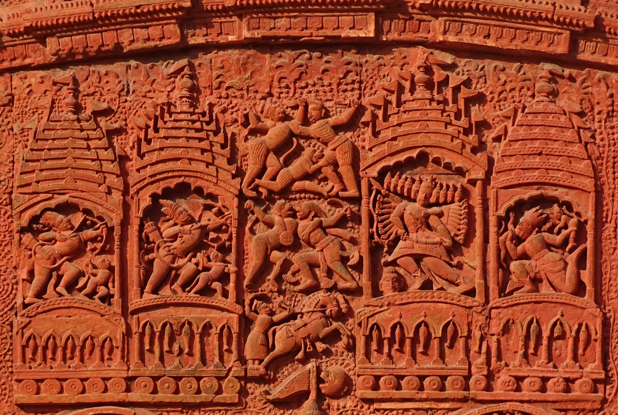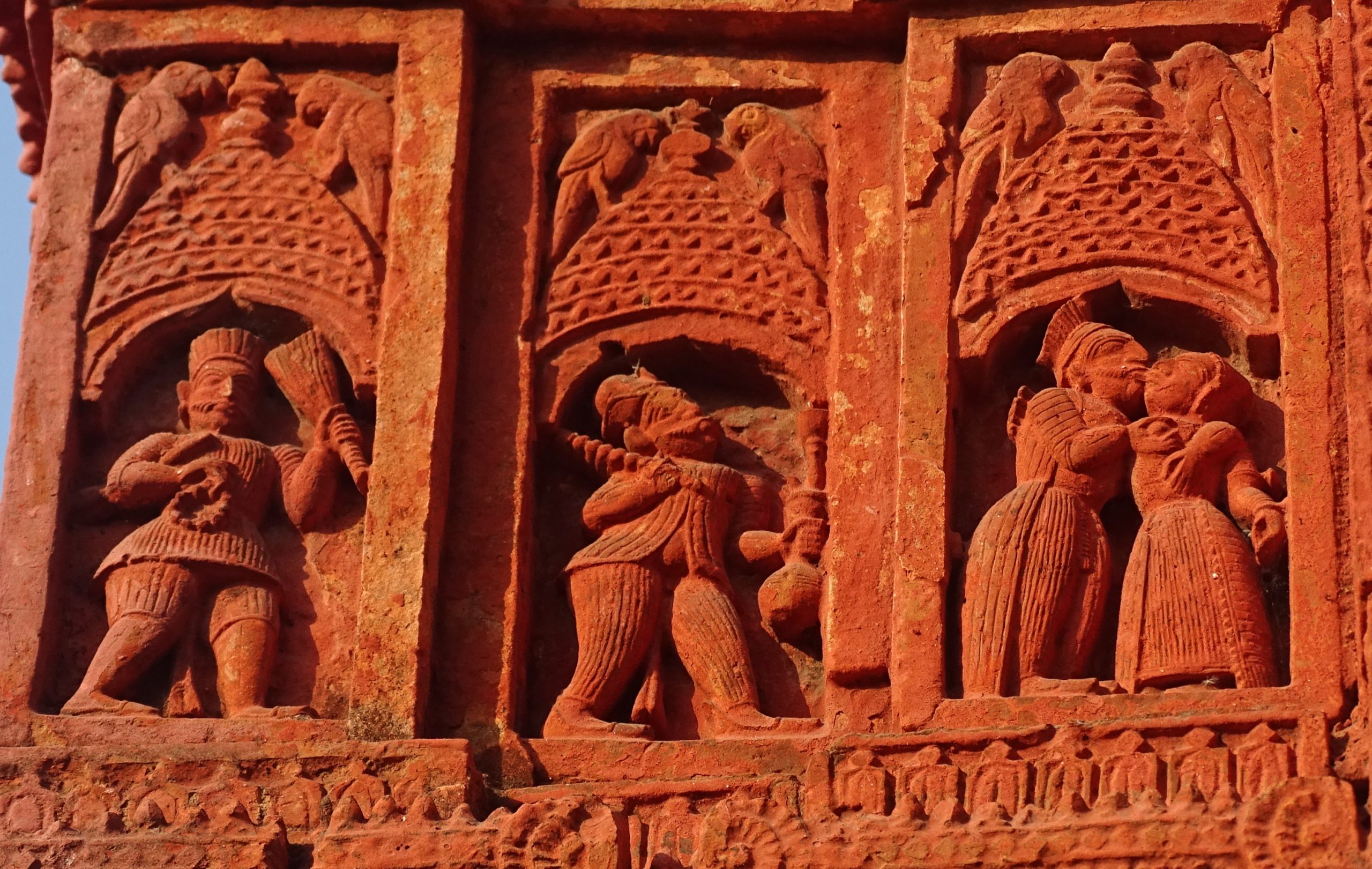 The temple has been renovated and several terracotta idols are still visible. The temple has several terracotta inscriptions