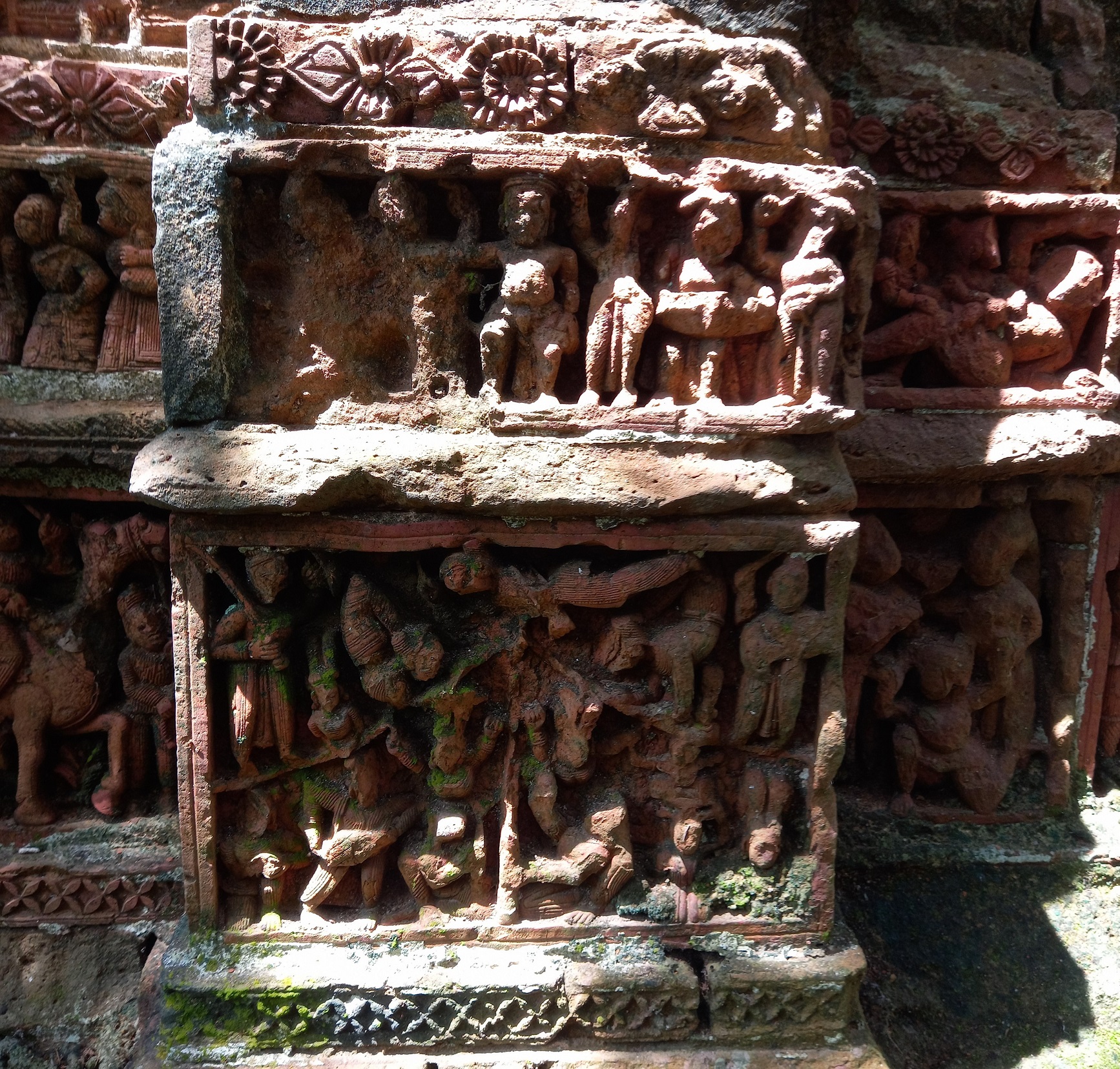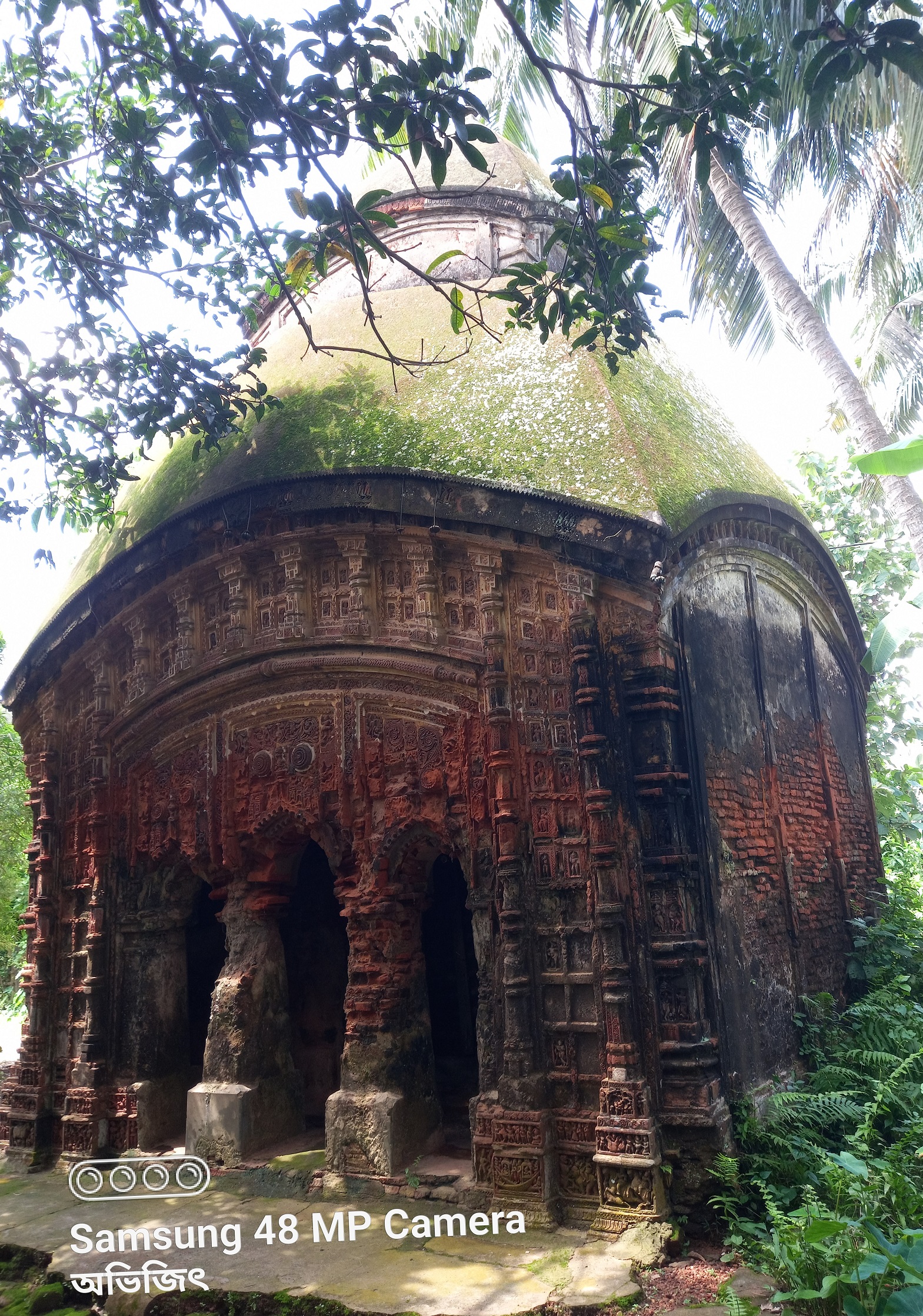 The temple, built in the 18th century, is an Atchala style of architecture. The east-facing temple is 10 feet long, 10 feet wide, and 20 feet high. Although the temple is dilapidated, many terracotta plaques are still present. The family's efforts to preserve the temple are commendable.