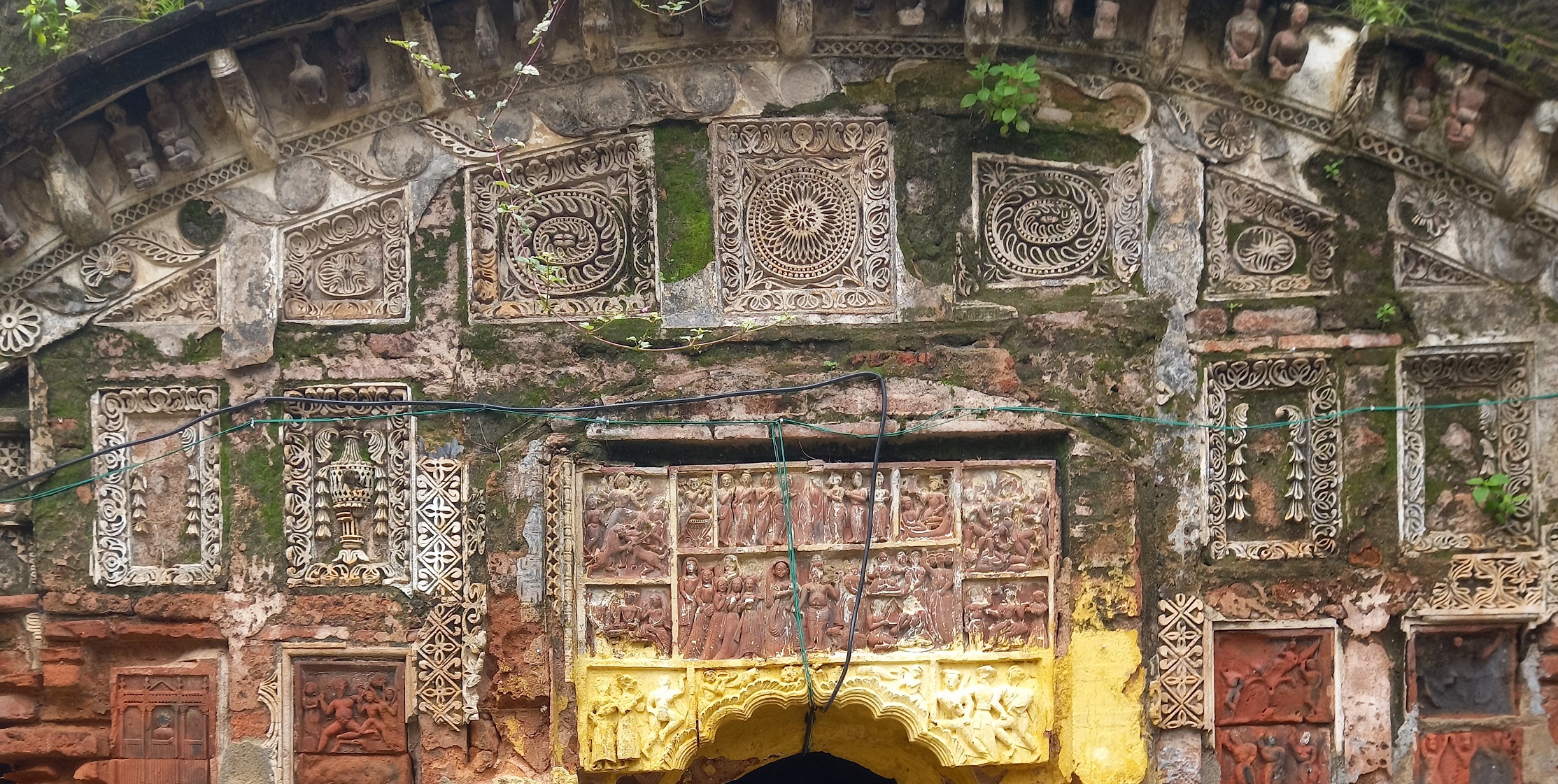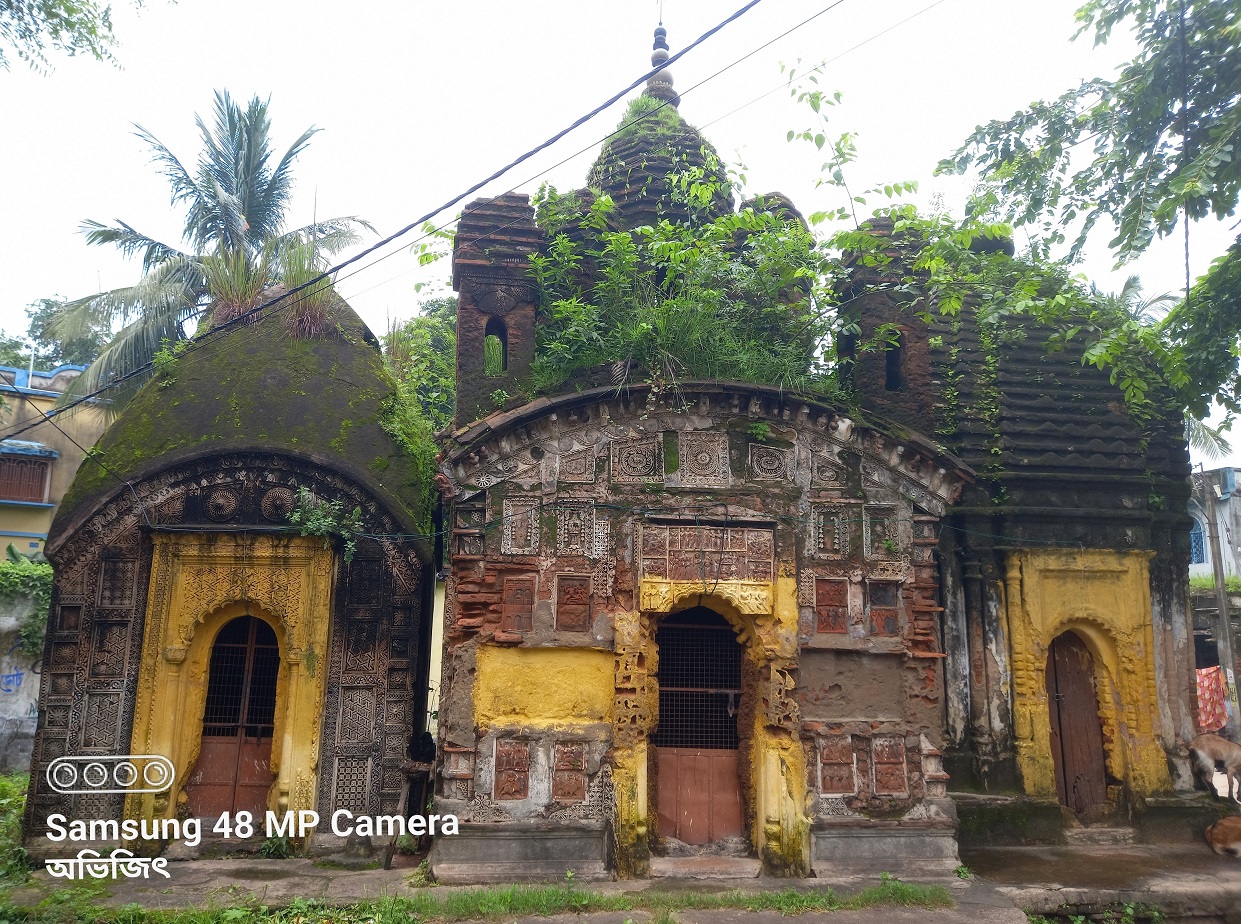 Among the temple culture that was prevalent in Dubrajpur, one of the enriched villages in Birbhum district, there is a cluster of three temples in Namopara, where the Nayak families live.The Navaratna Temple is situated between a Char Chala Temple on one side and a Shikhar Temple of the Pancharath Gharana on the other. The beautiful decoration of this dilapidated temple is clearly evident from its current condition. Among the plaques, the Mahishasuramardini Durga, Shiva's wedding, beautiful flower embroidery designs, chains, and women in the atrium were once very exquisite.