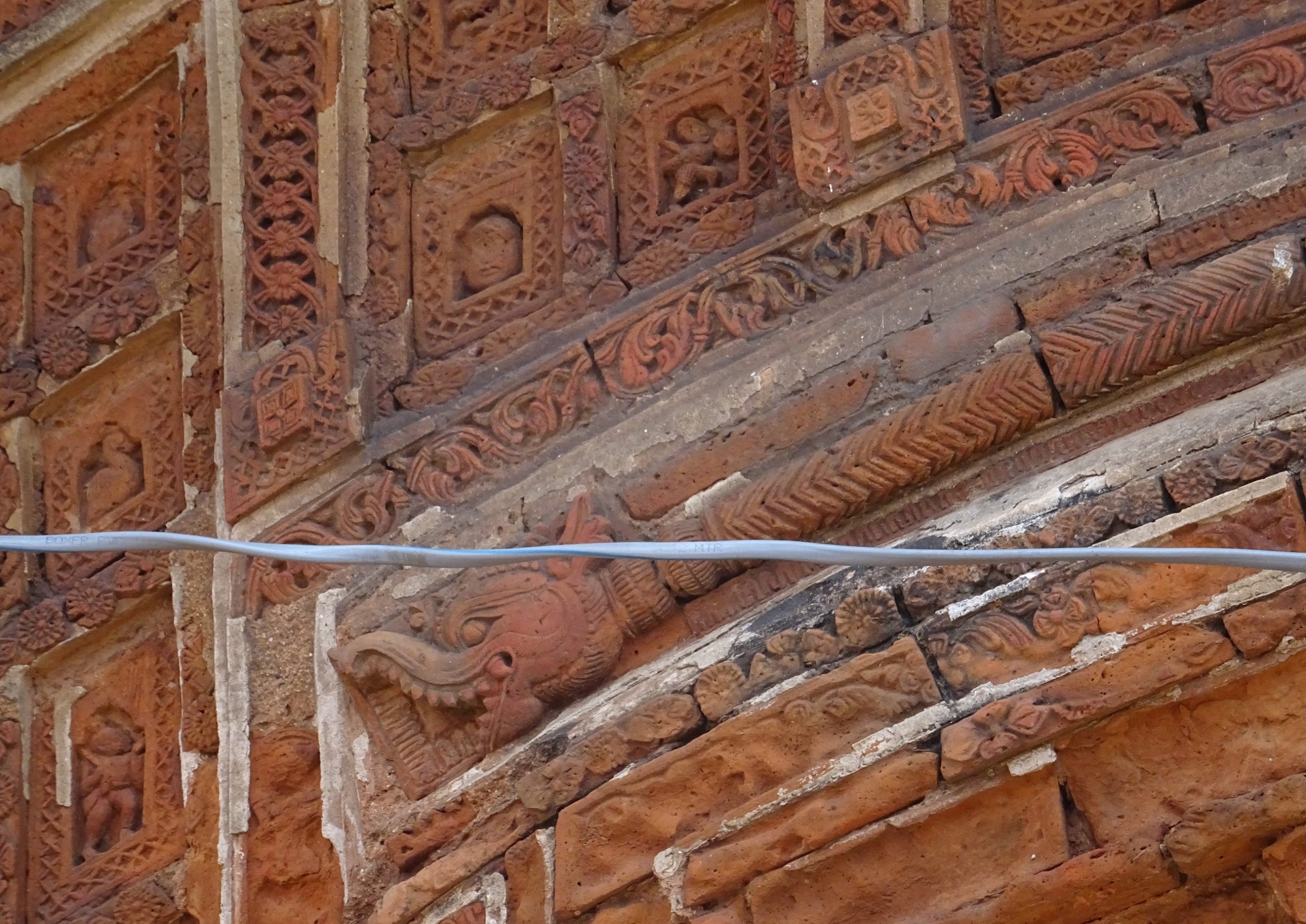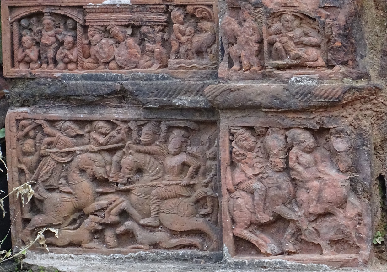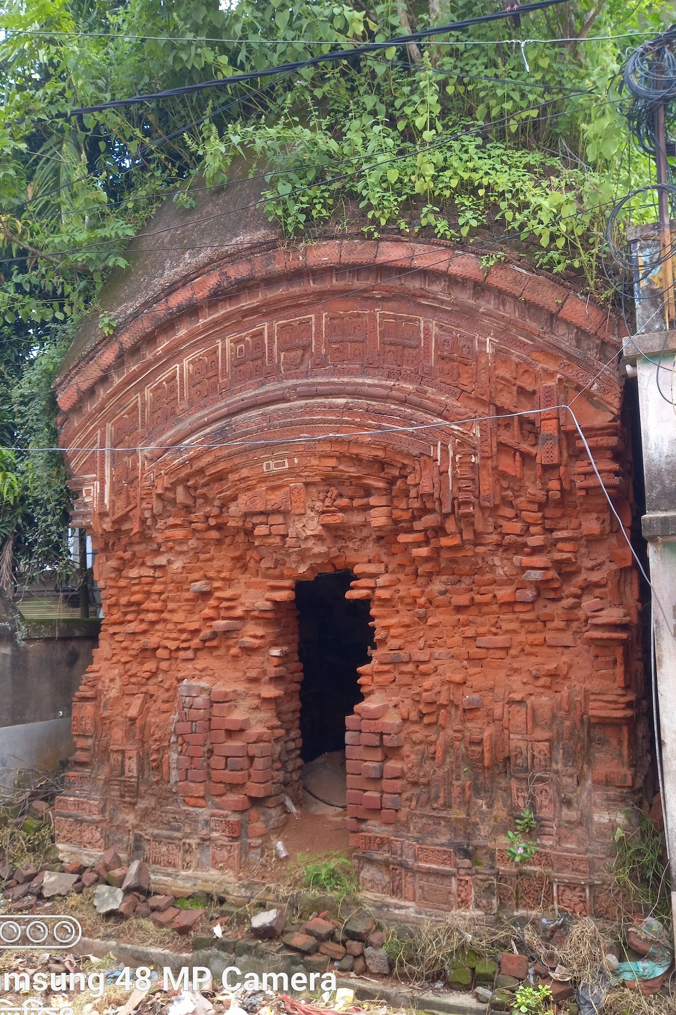 The Atchala Shiva Temple is located in Bara Kalitala Para under Amad Pur Gram Panchayat in Memari Block 1 of East Burdwan District. The famous temple in this area is Bara Maa Kali. There is an Atchala Shiva Temple on the road next to this temple. The temple is now dilapidated and abandoned. Despite this, several terracotta plaques are still present in the foundation of the temple. Social scenes, mythological stories, hunting scenes, etc. The temple has an almost destroyed foundation plaque. The current deteriorated shape of the temple suggests that the temple was once a very magnificent monument.
