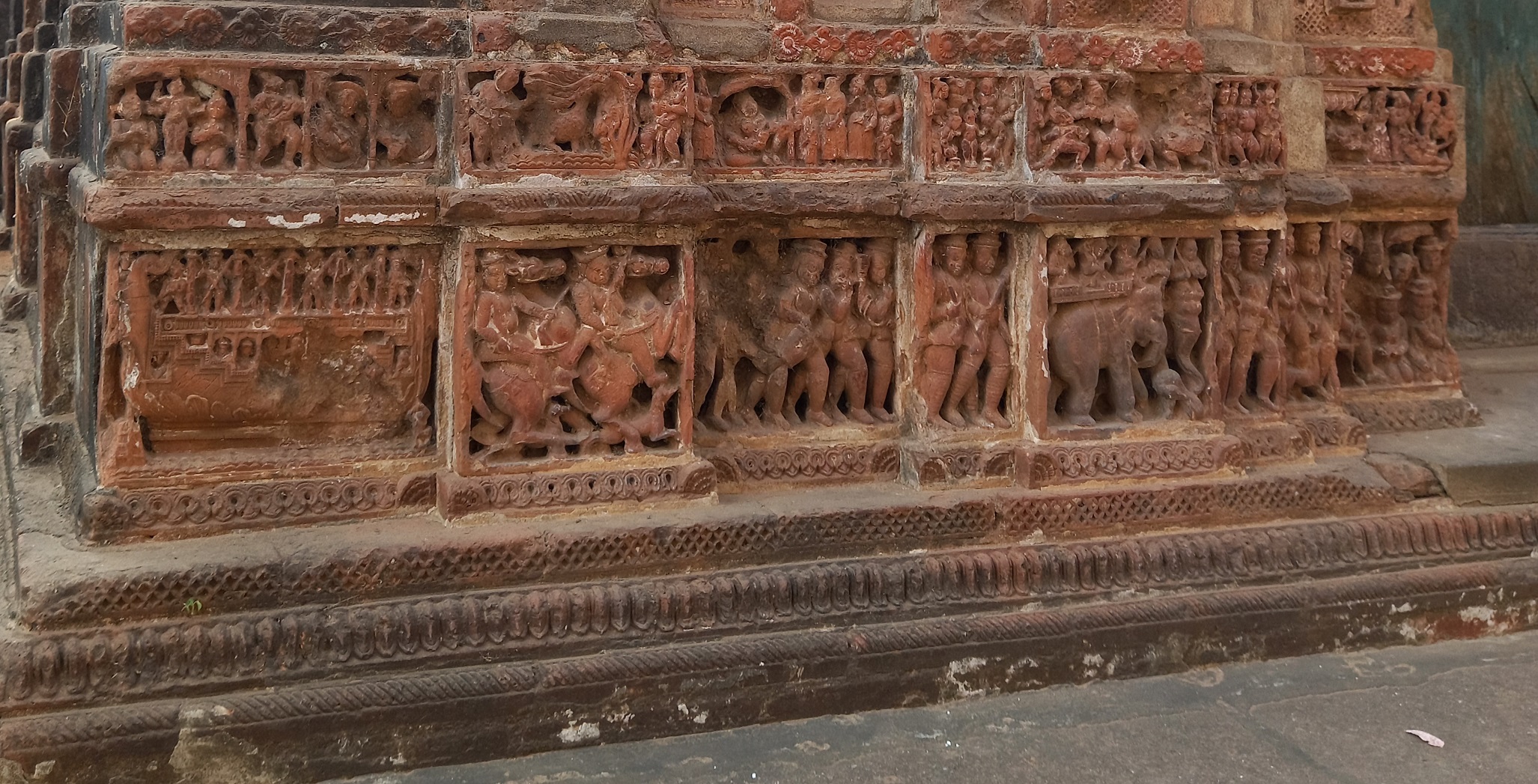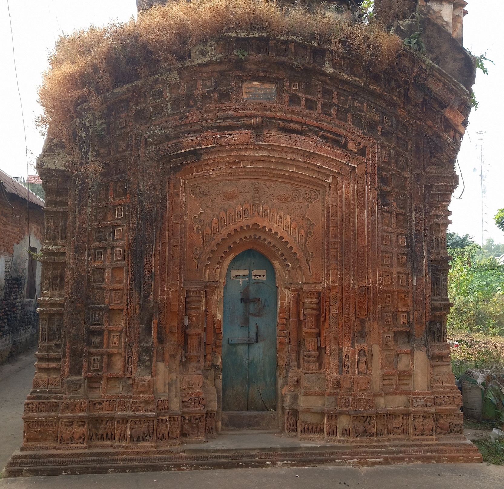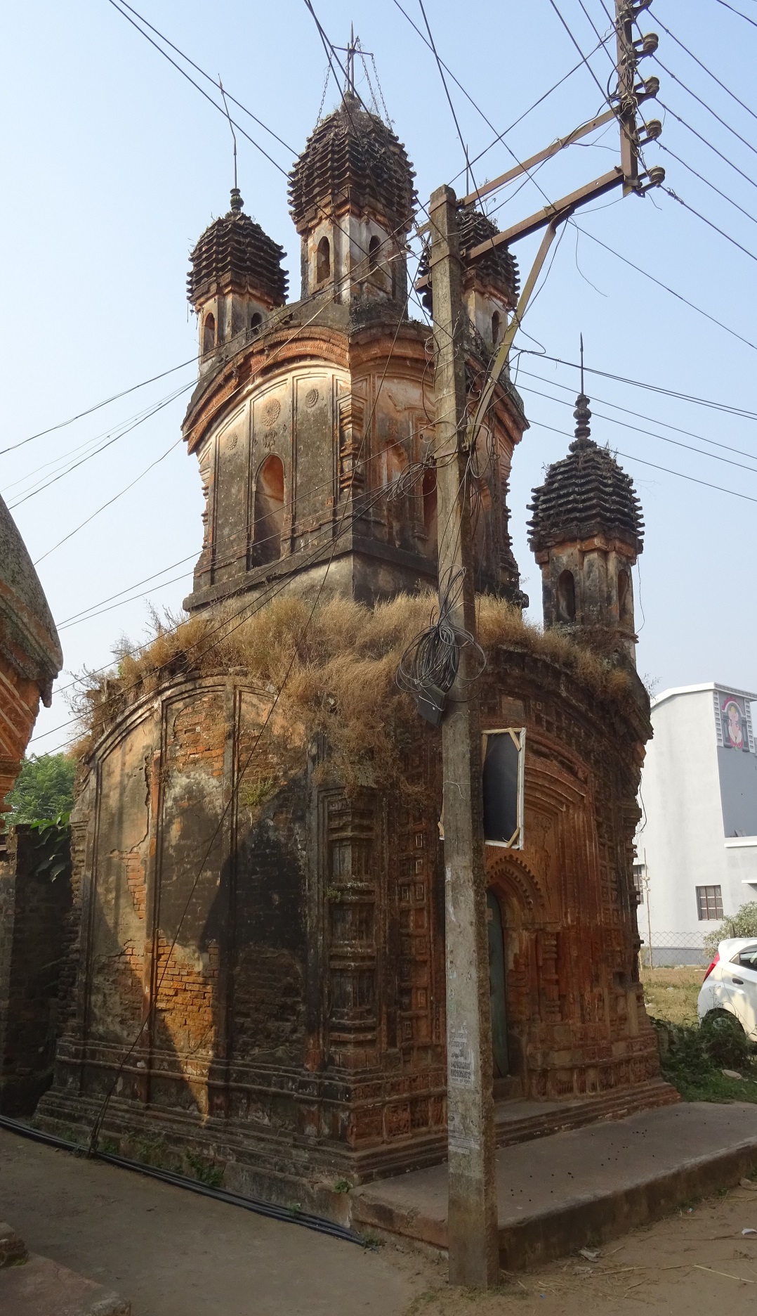Baidyapur village under Kalna thana of Purba Burdwan district is notable for its multiple architectural features. The Navaratna style temple at Rastala is currently painted completely white. The temple's roof are made in a straight shape instead of curved cornices. The four spires at the four corners of the first roof are slightly larger than the four spires on the second roof, and the central spire is the largest. There is a large Nat Mandir in front of the temple. The entire courtyard is surrounded by buildings. The temple and the courtyard were once built of terracotta bricks.