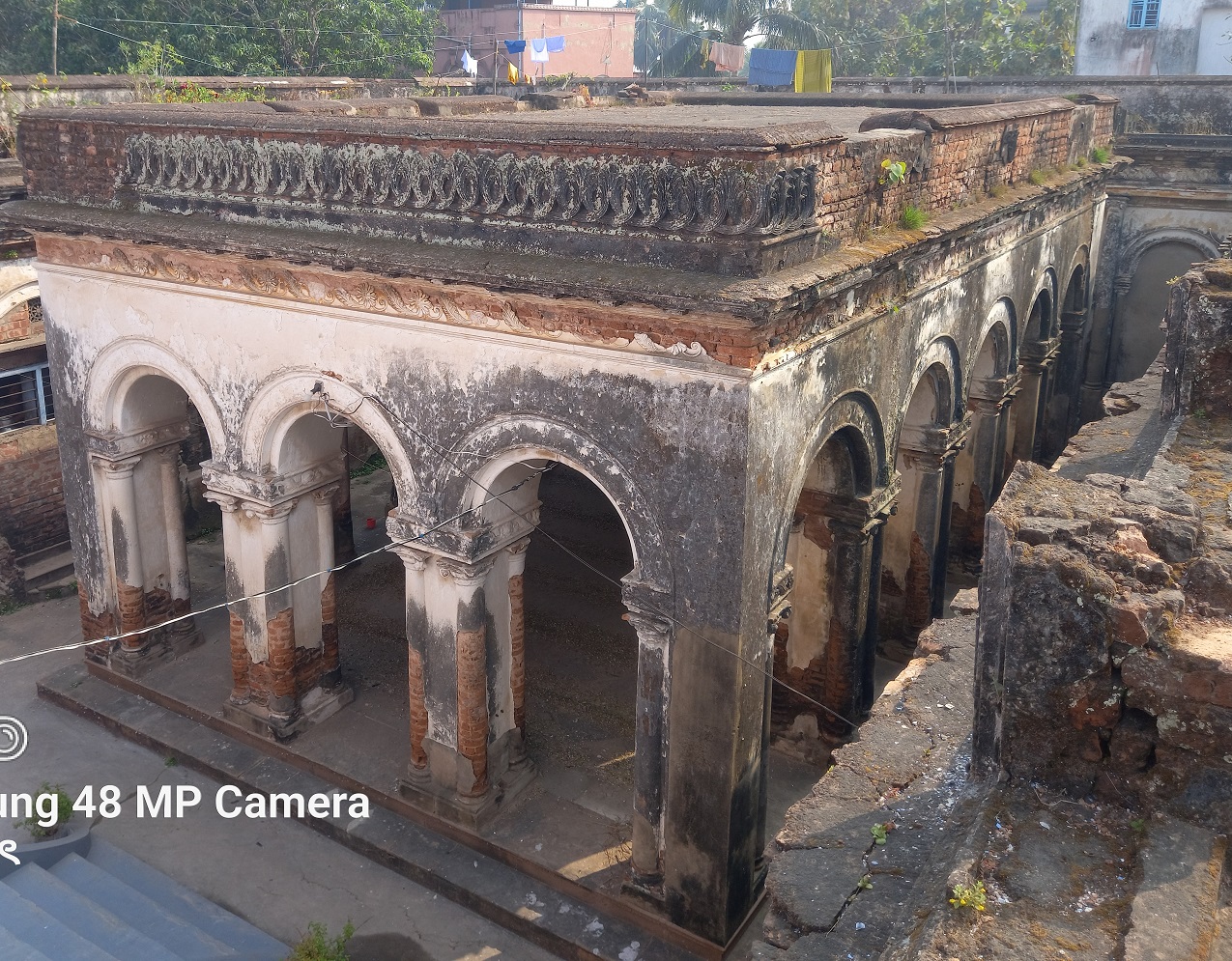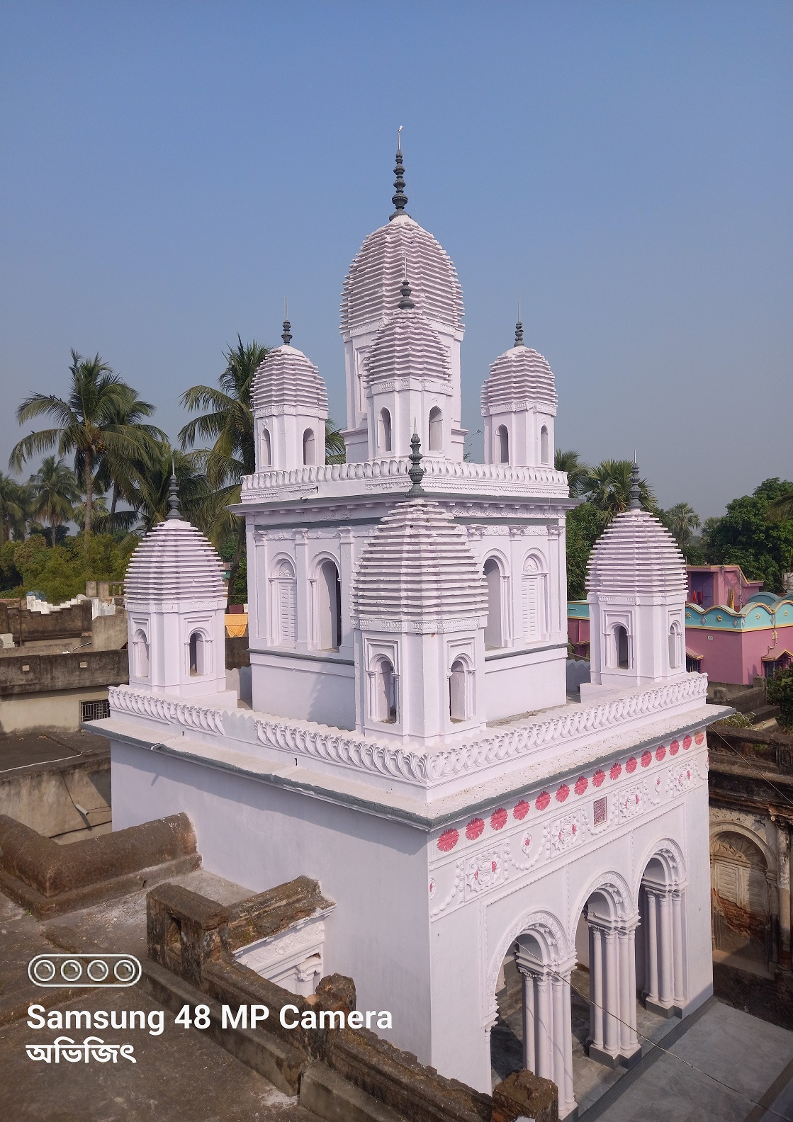 Baidyapur village under Kalna thana of Purba Burdwan district is notable for its multiple architectural features. The Navaratna style temple at Rastala is currently painted completely white. The temple's roof are made in a straight shape instead of curved cornices. The four spires at the four corners of the first roof are slightly larger than the four spires on the second roof, and the central spire is the largest. There is a large Nat Mandir in front of the temple. The entire courtyard is surrounded by buildings. The temple and the courtyard were once built of terracotta bricks.
