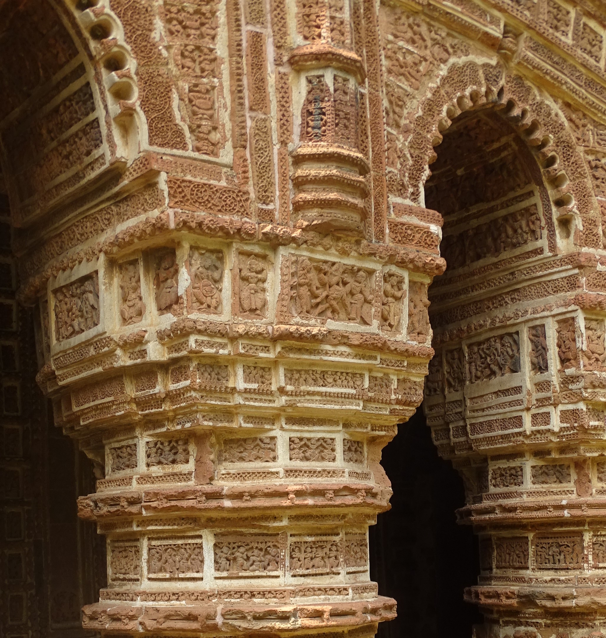 The most famous terracotta decorated temple in West Bengal is the Shyamrai Temple in Bishnupur. This famous Pancharatna temple is located in the Raj Darbar, Dalmadal Para, Bishnupur. The foundation inscription of the temple shows that this temple was built in 949 Mallabde i.e. 1643 AD by Raja Raghunath Singh, son of Raja Bir Hambir. Other plaques in the temple are believed to mention the names of the artists and supervisors. There is a narrow circumambulation path around it with a three-arched verandah all around. The four peaks surrounding the roof are square and the central peak is octagonal.